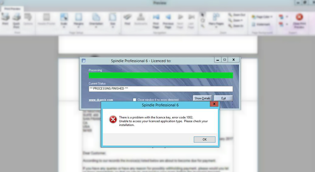 With every licence for Credit Hound, you are entitled to a restricted licence for Spindle Professional. This only allow printing from Credit Hound and no other application. If you attempt to print to Spindle Professional when using this licence key you will see the error shown above.