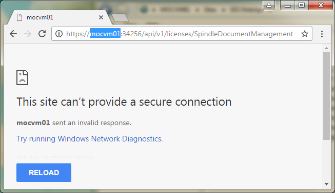 If the web site does not respond, but the URL http://localhost:34256/api/v1/licenses/SpindleDocumentManagement works correctly, It suggests that the HTTPS protocol is not working.
