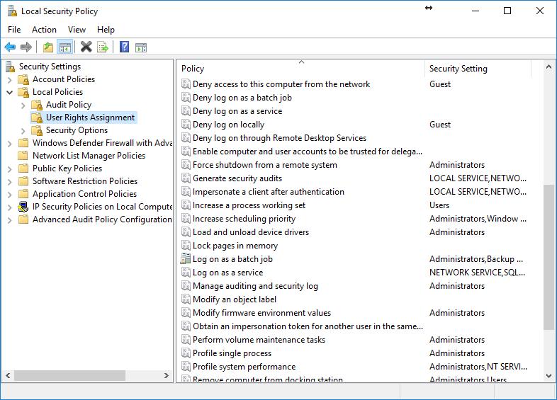 For more information regarding User Rights Assignment, see this MS technote: https://technet.microsoft.com/en-us/library/dn221963(v=ws.11).aspx