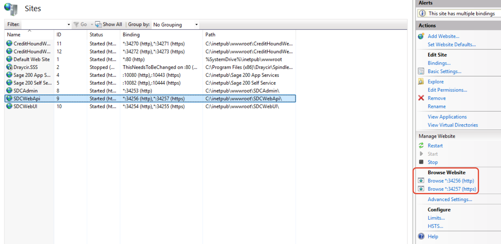 On the Sage server, open IIS and navigate to Sites, then select SDCWebApi. On the right-hand side of the window, under Browse Website, there should be bindings for ports 34256 and 34257: