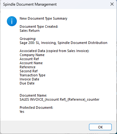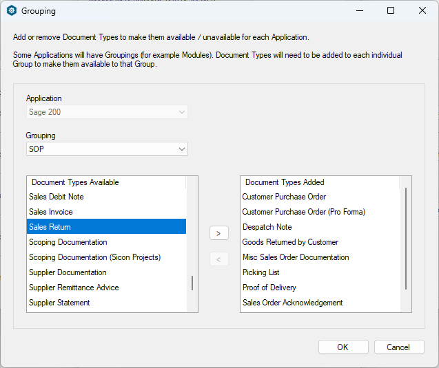 Add the new document type to each group (eg each area of Sage 200 you want the document to be available in), as well as in the Spindle Document Distribution group if you want archive this document type through Spindle Document Distribtion.