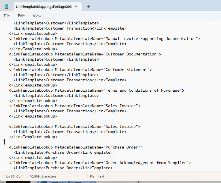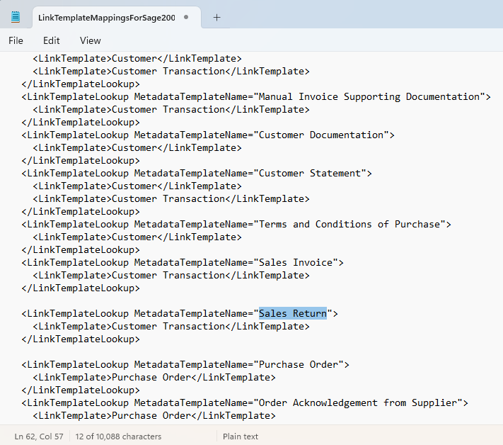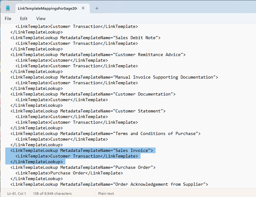 Save the file. In our case, the LinkTemplate for Sales Invoice, Customer Transaction, is valid for our new document type. You can see other possible LinkTemplates in this file, such as Customer, Purchase Order, Pro Forma etc...