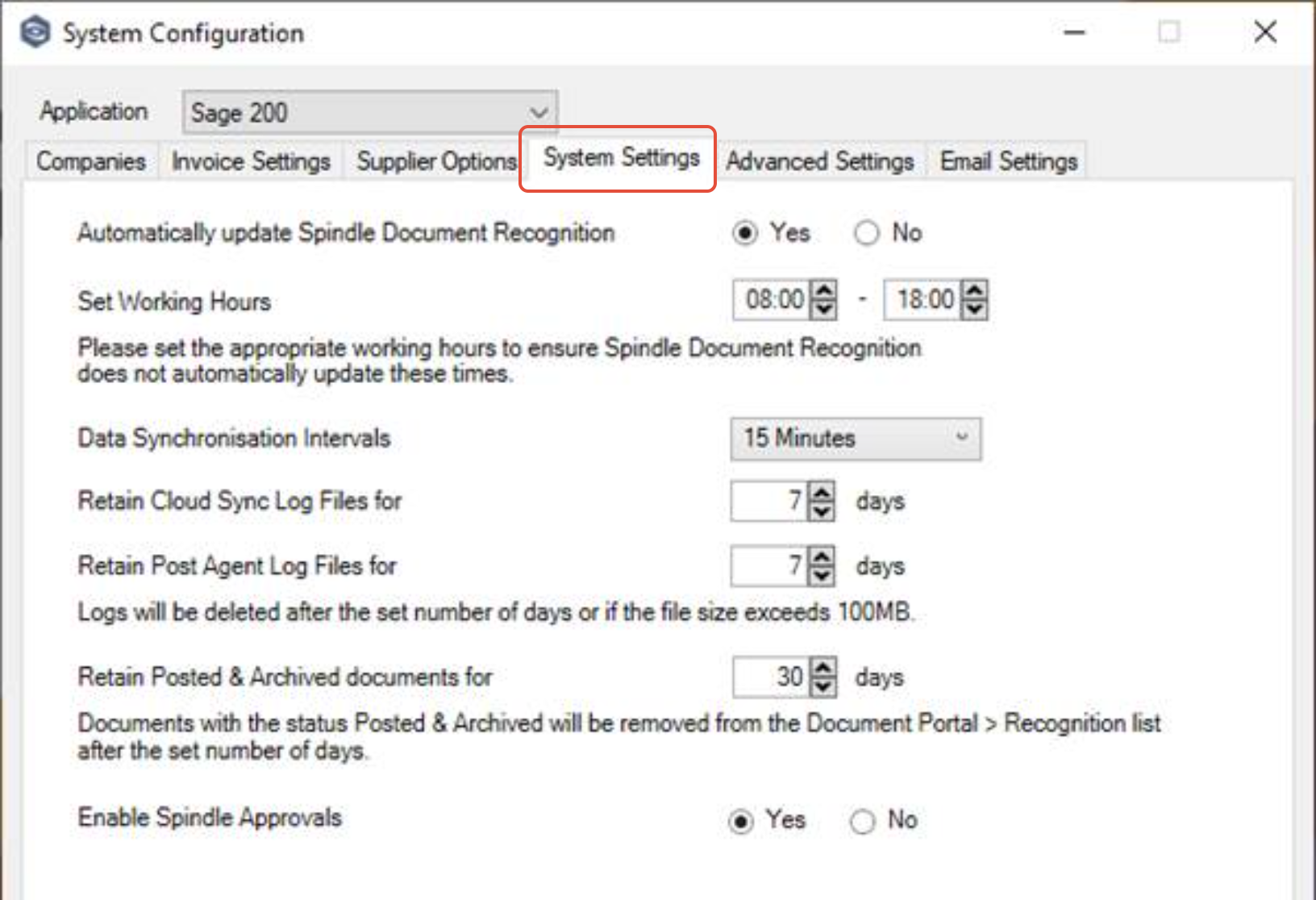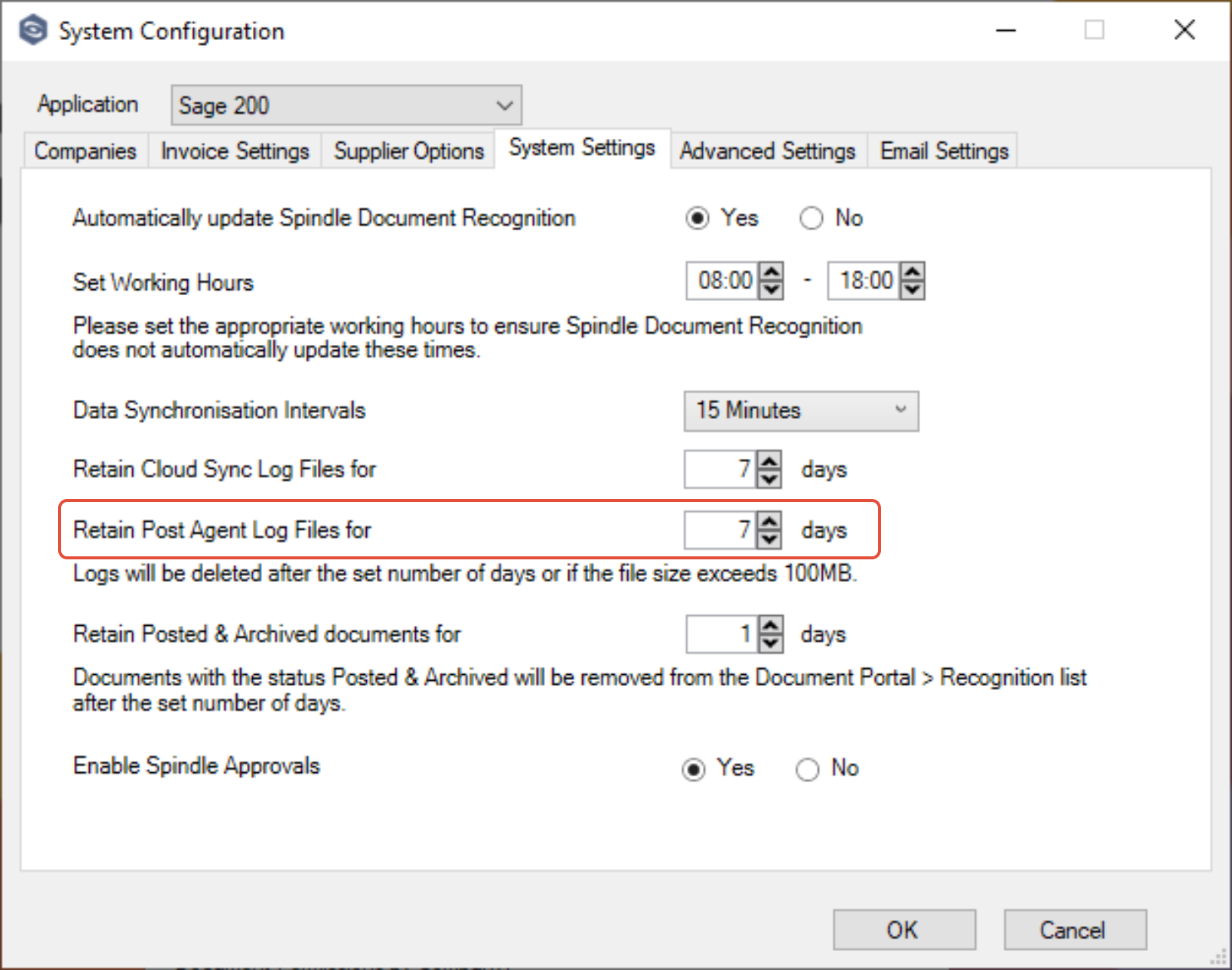 By default, Spindle Purchase Invoice Recognition (SPIR) retains invoices with a status of Posted & Archived—meaning they have been posted to Sage 200 and archived in Spindle Document Capture—for 30 days before removing them from the Document Portal.